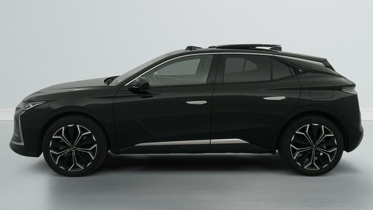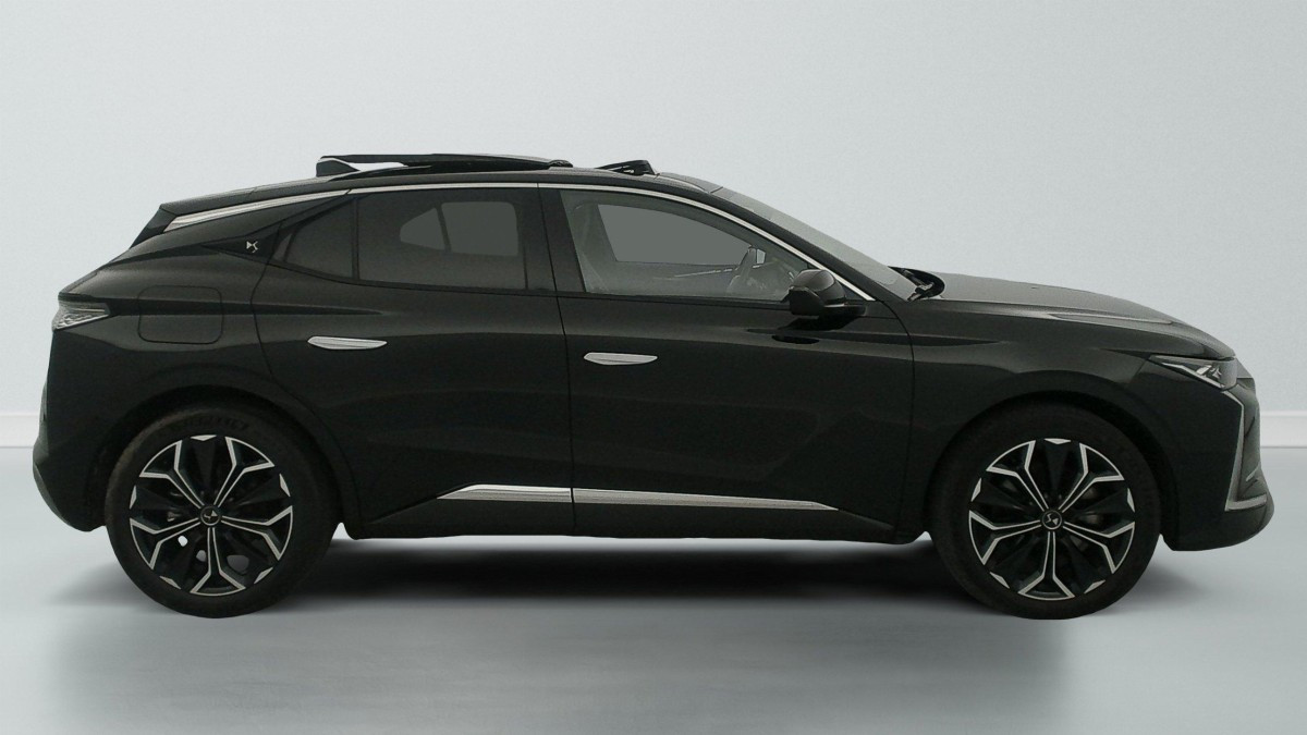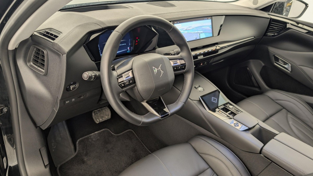 Intérieur Cuir grainé Noir Basalte et Toile DS : Ciel de pavillon clair Décors de panneaux de porte Chrome guilloché Volant en cuir fleur Mistral Console centrale en Toile DS Mistral Planche de bord en toile DS Noir Basalte façon écaille Panneaux de portes en toile DS Noir Basalte façon écaille Sellerie en Cuir grainé Noir Basalte et Toile DS