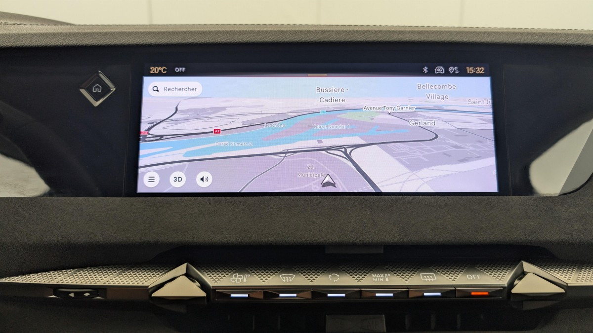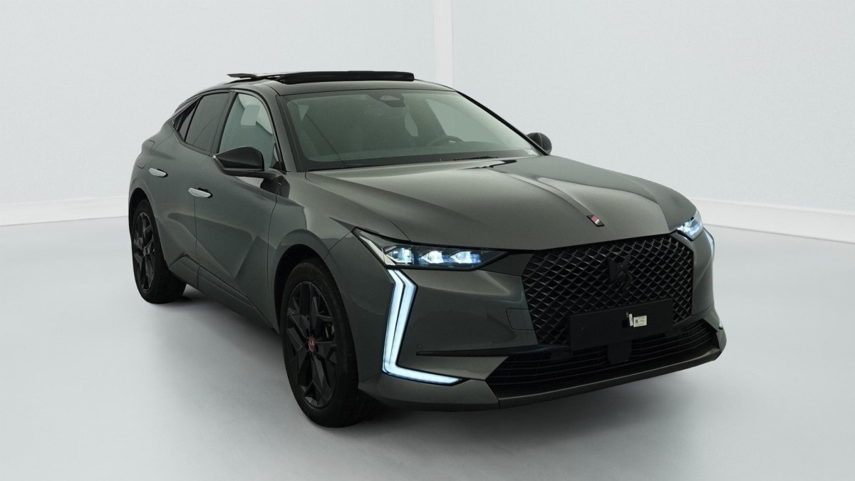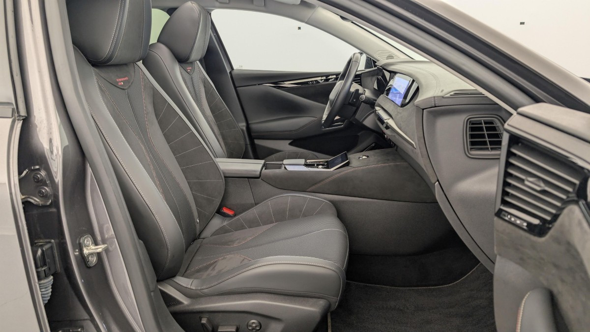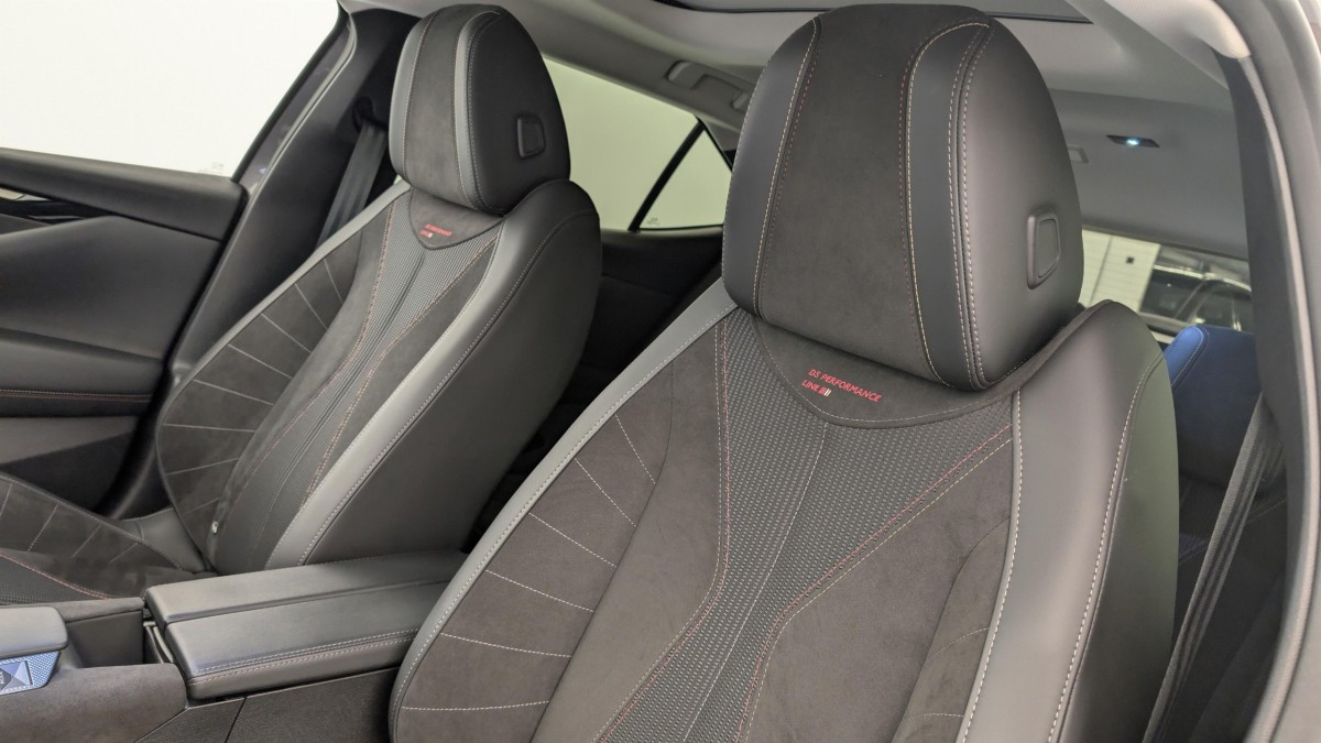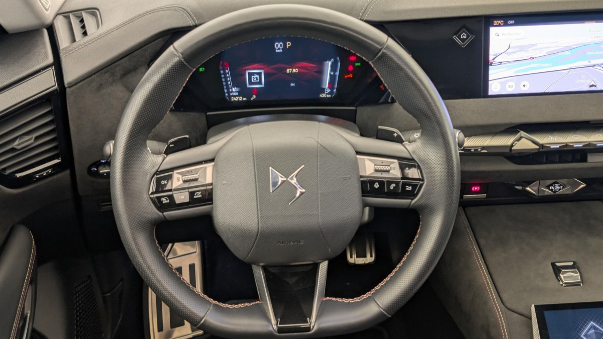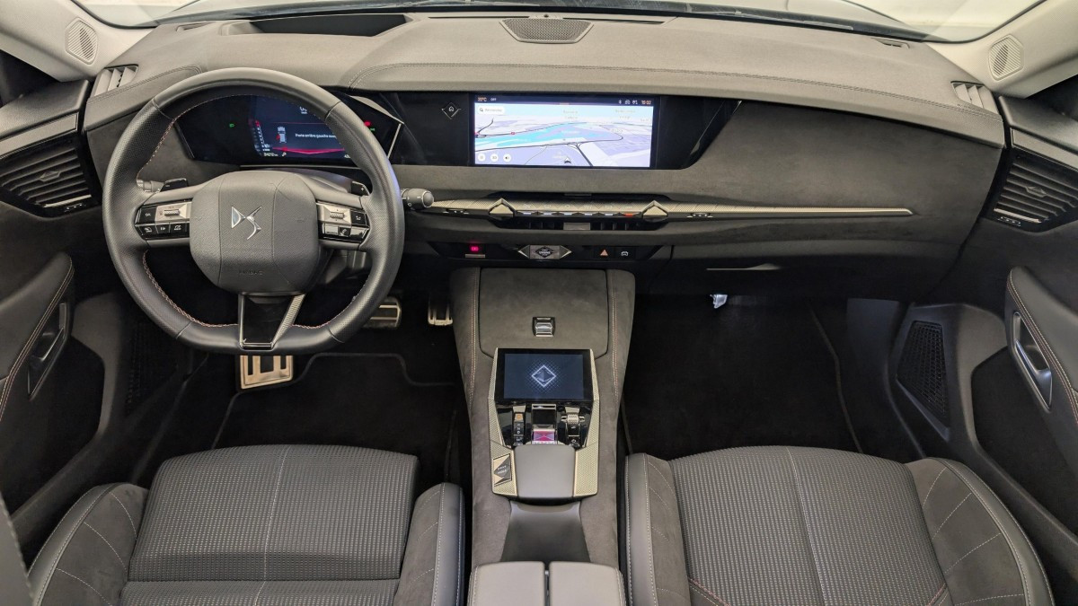 Intérieur Tissu Tressé Basalte avec Alcantara : Planche de bord en alcantara Panneaux de portes en alcantara Console centrale en alcantara Sellerie en Tissu Tressé Basalte avec Alcantara et toile DS Décors de panneaux de porte Chrome guilloché Volant en cuir fleur Mistral avec surpiqûres Ciel de pavillon Salin